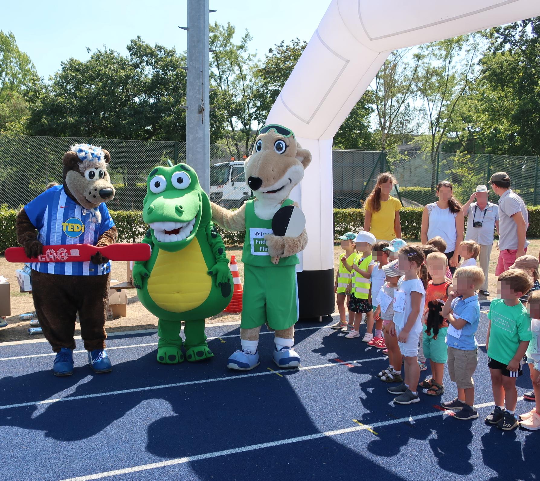 Kroko bekommt von Herthinho noch gründlich die Zähne geputzt, bevor sie zusammen mit Fridolin Flink den Lauf der Kinder starten.