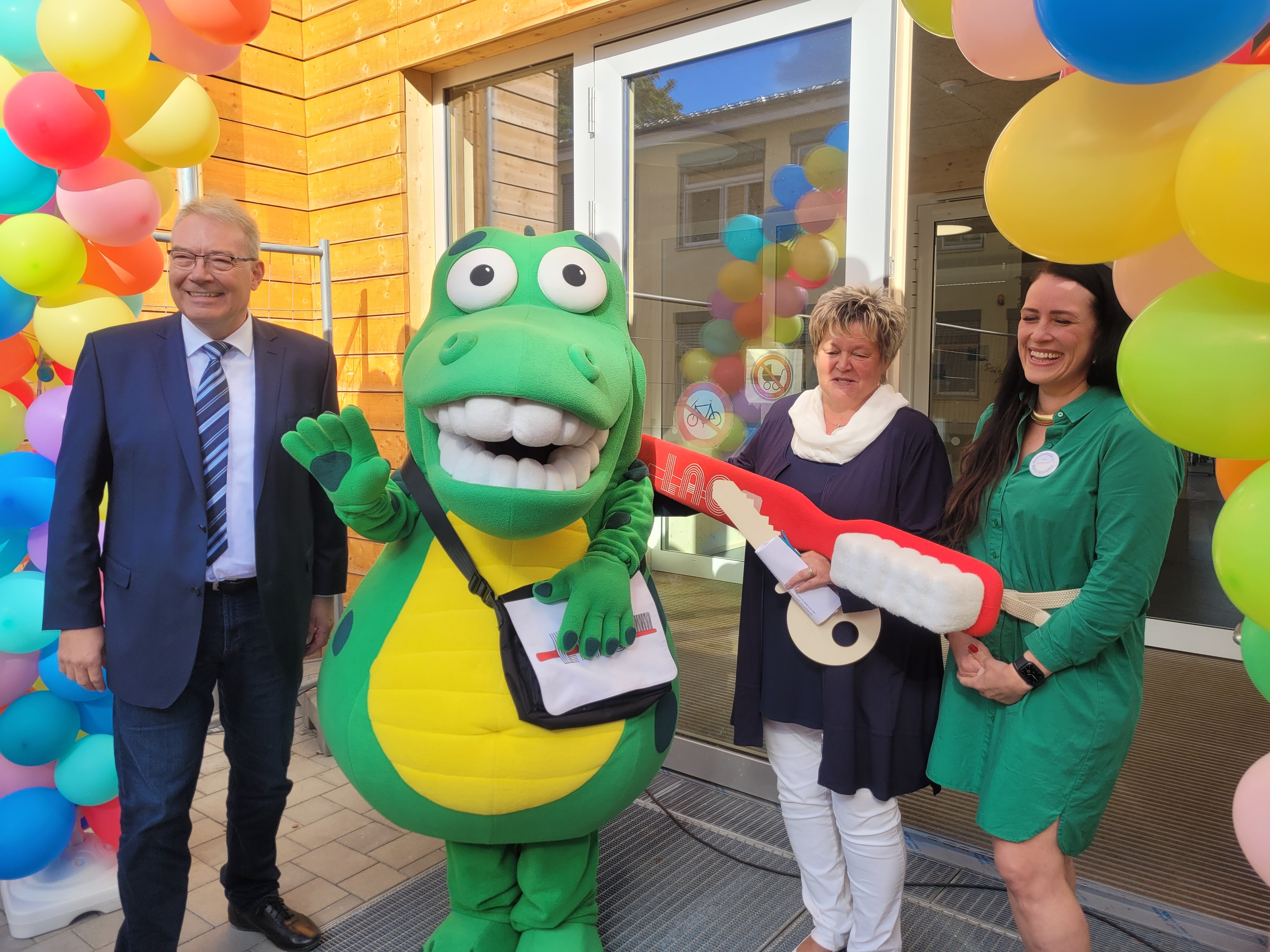 Bildungsstadtrat Harald Muschner lässt es sich nicht nehmen, Kroko die Zähne sauber zu putzen.